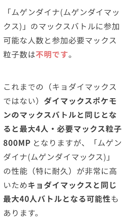 注2:ムゲンダイナはダイマックスなので、4人バトルの可能性がかなり大きいかもしれません。40人バトルのような対策強化トレーナーによる支援は難しく、4人バトルでは個人レベルの準備が重要になります。