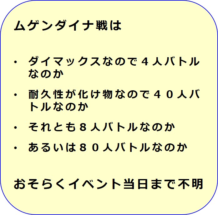 注3:「◆2. ムゲンダイナとのバトル」、「◆5. バトル記(4人)」、「◆6. バトル記(40人)」は、「攻めと守りのバランス」をとる考え方を紹介したものです。イベント初日(08/23)の具体的な戦い方については「◆8. 初日の 4 人バトルと 40 人バトル」において説明しています。