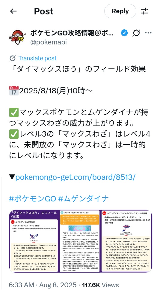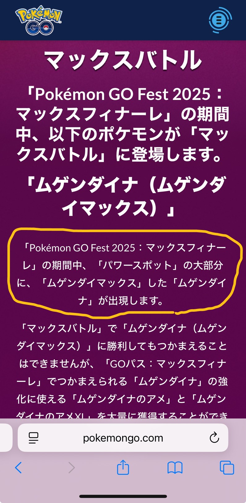 「Pokémon GO Fest 2025:マックスフィナーレ」(2025.08.23&24 土・日 10:00 ~ 18:00)の期間中、パワースポットには「過去に出現した様々な(キョ)ダイマックスポケモンとムゲンダイナ」が出現します。