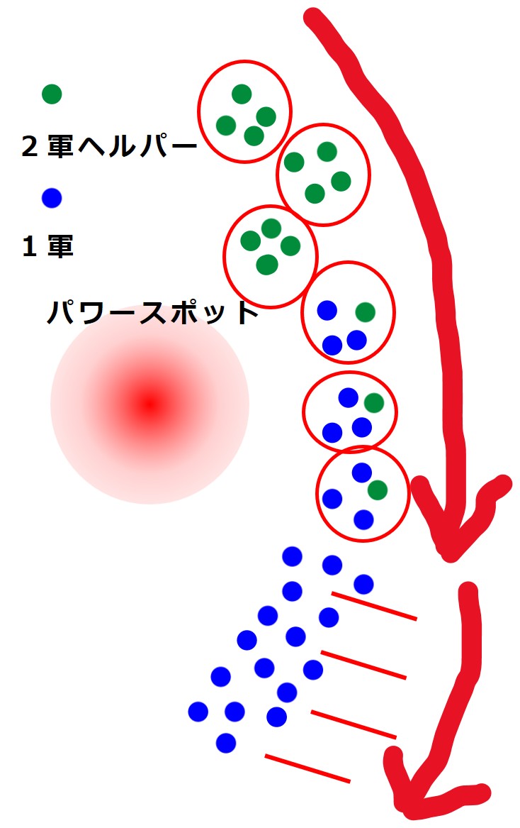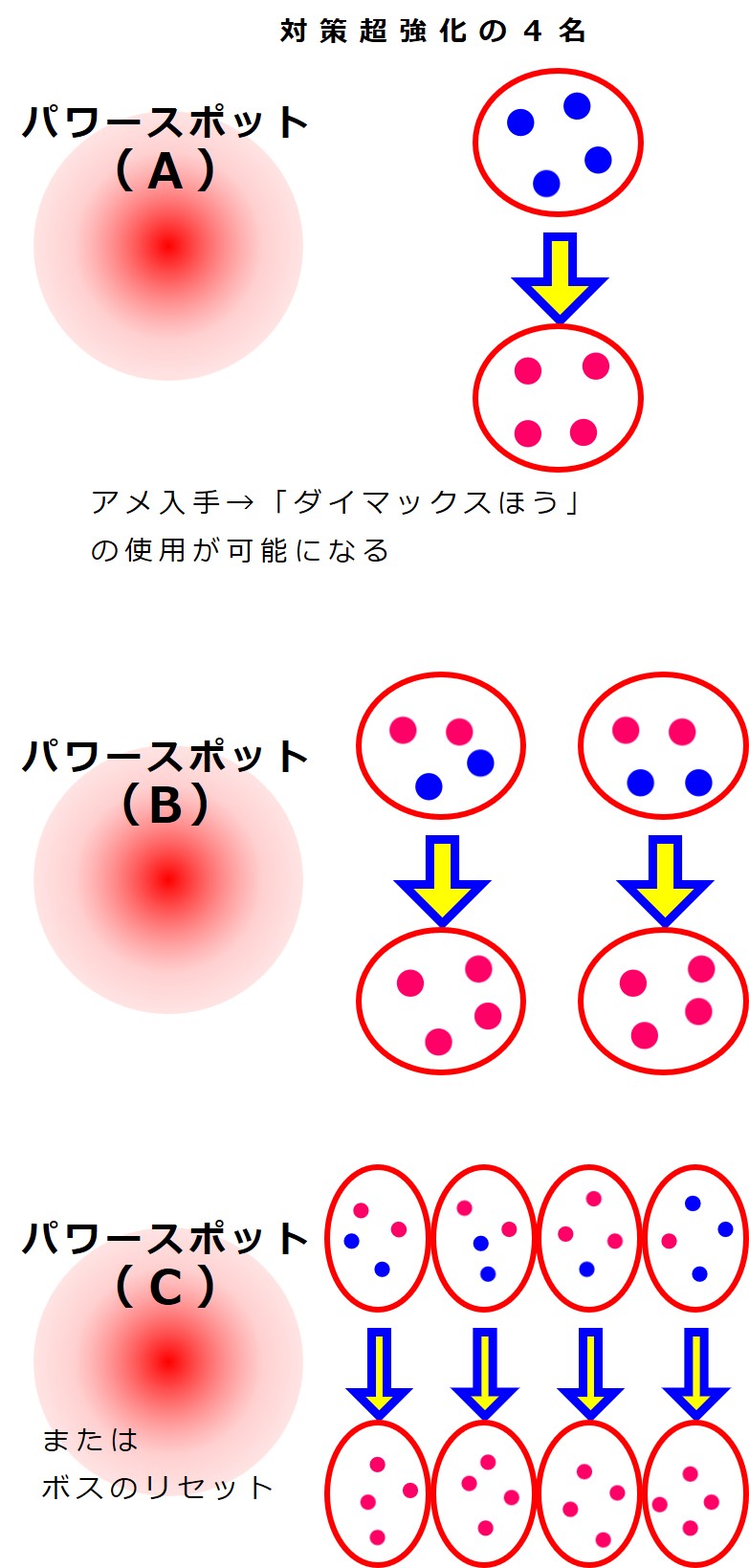 注1:こんな風にうまくいくとは限りません。ムゲンダイナが異常に強いときは、先に第2軍が戦い、ムゲンダイナのアメを得てから第1軍のバトルを支援するという方法も必要になるかもしれません。その際は、パワースポットを変える必要があります。