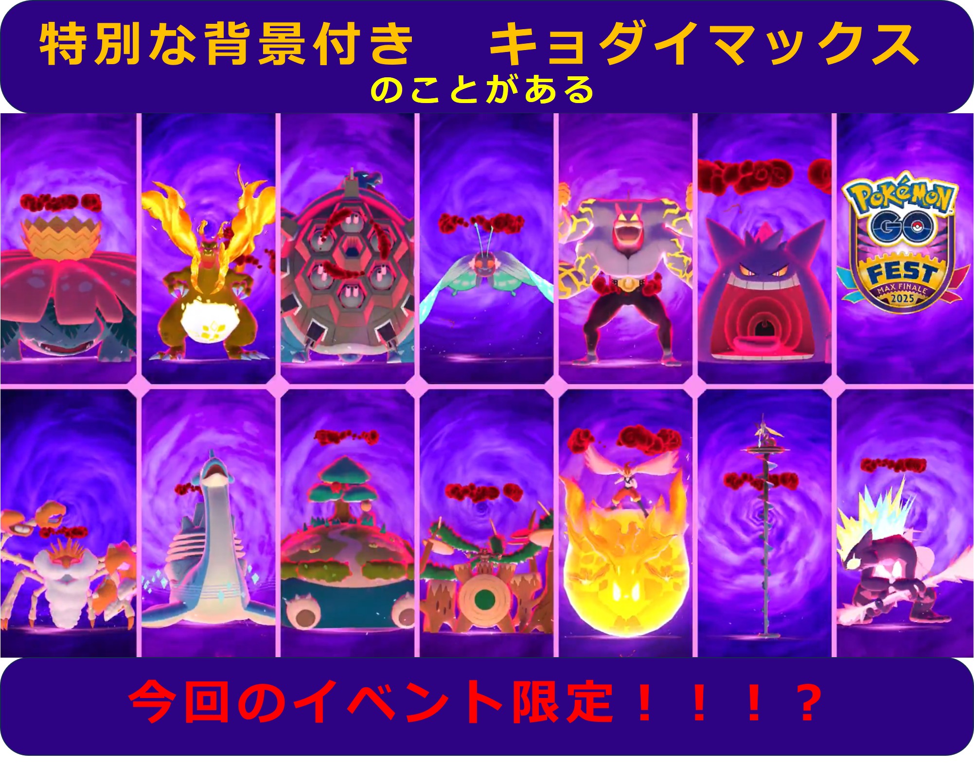 08/23(土曜)と08/24(日曜)に、過去に出現した14種類のキョダイマックスが現れます。イベント日に捕獲した(キョ)ダイマックスは、たまに特別な背景付きの可能性もあるそうです。