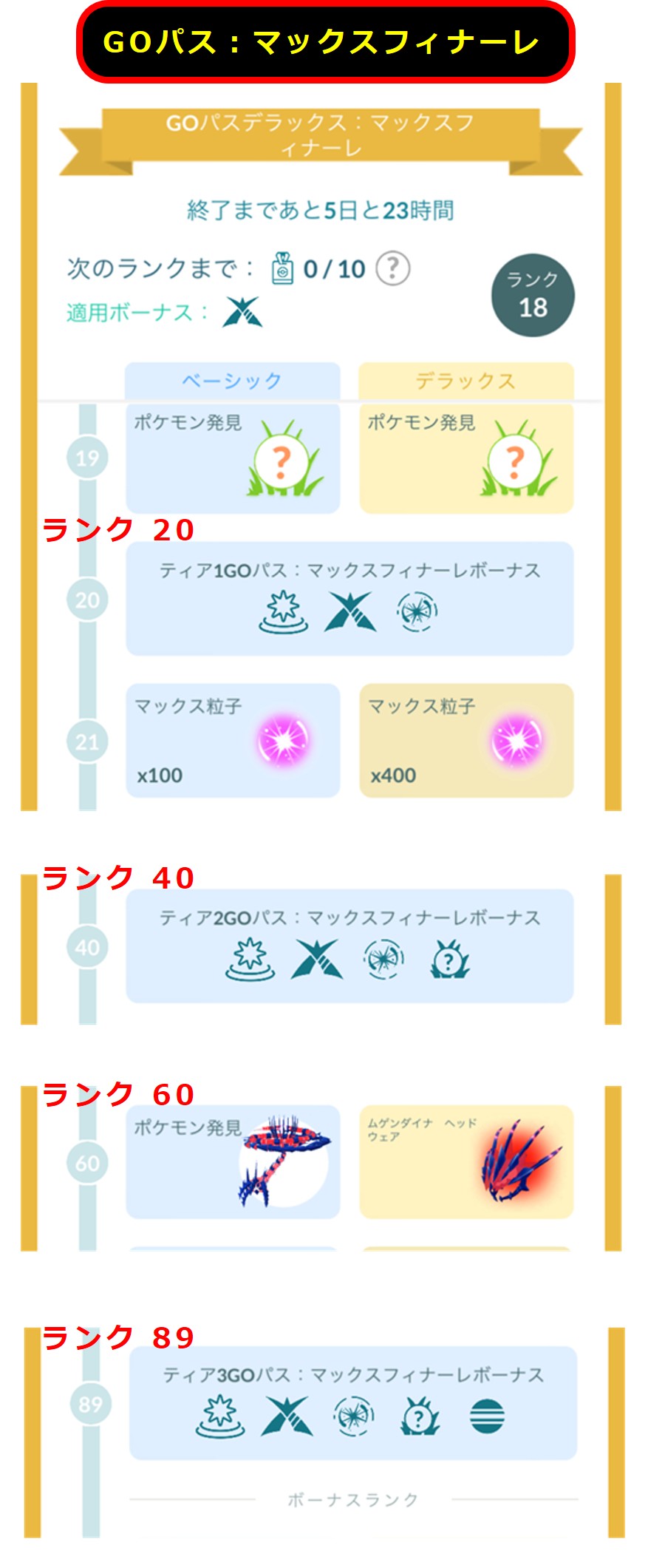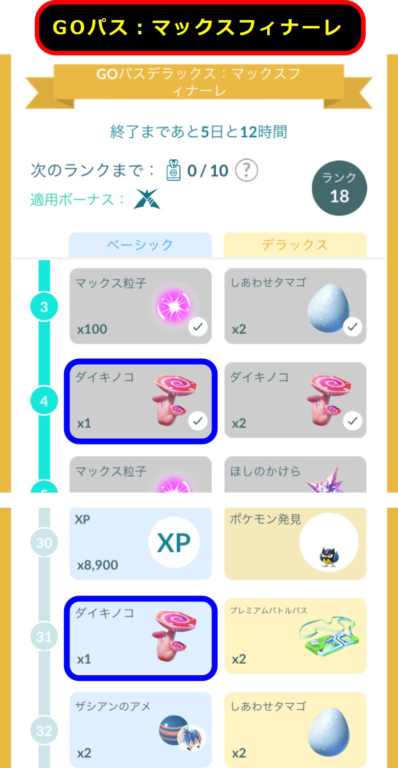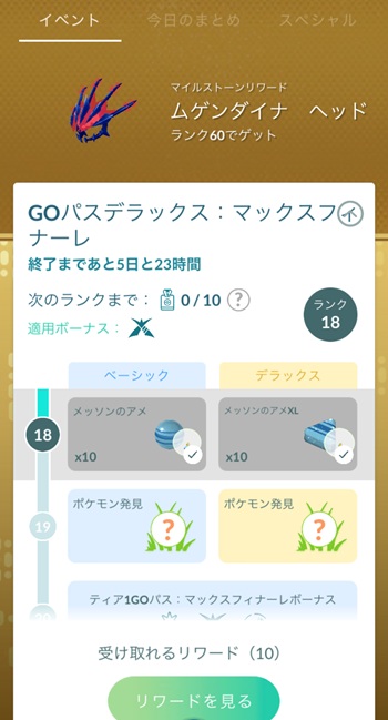 「GOパス:マックスフィナーレ」(08/18 月曜配布のタスク)のリワードを見てみましょう。(注:8月初めに配布される「GOパス: 8 月」とは別に、マックスフィナーレ用のタスクが配布されます)
