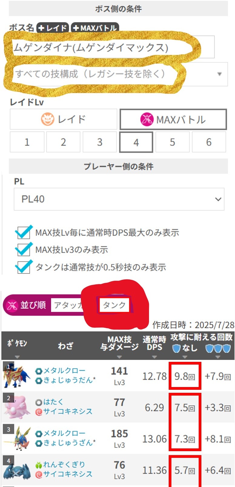 「みんポケ」の対策チェックページで7月末に調べたときと比べると、ムゲンダイナの攻撃に耐える回数が 2/3 以下へ減少しました。