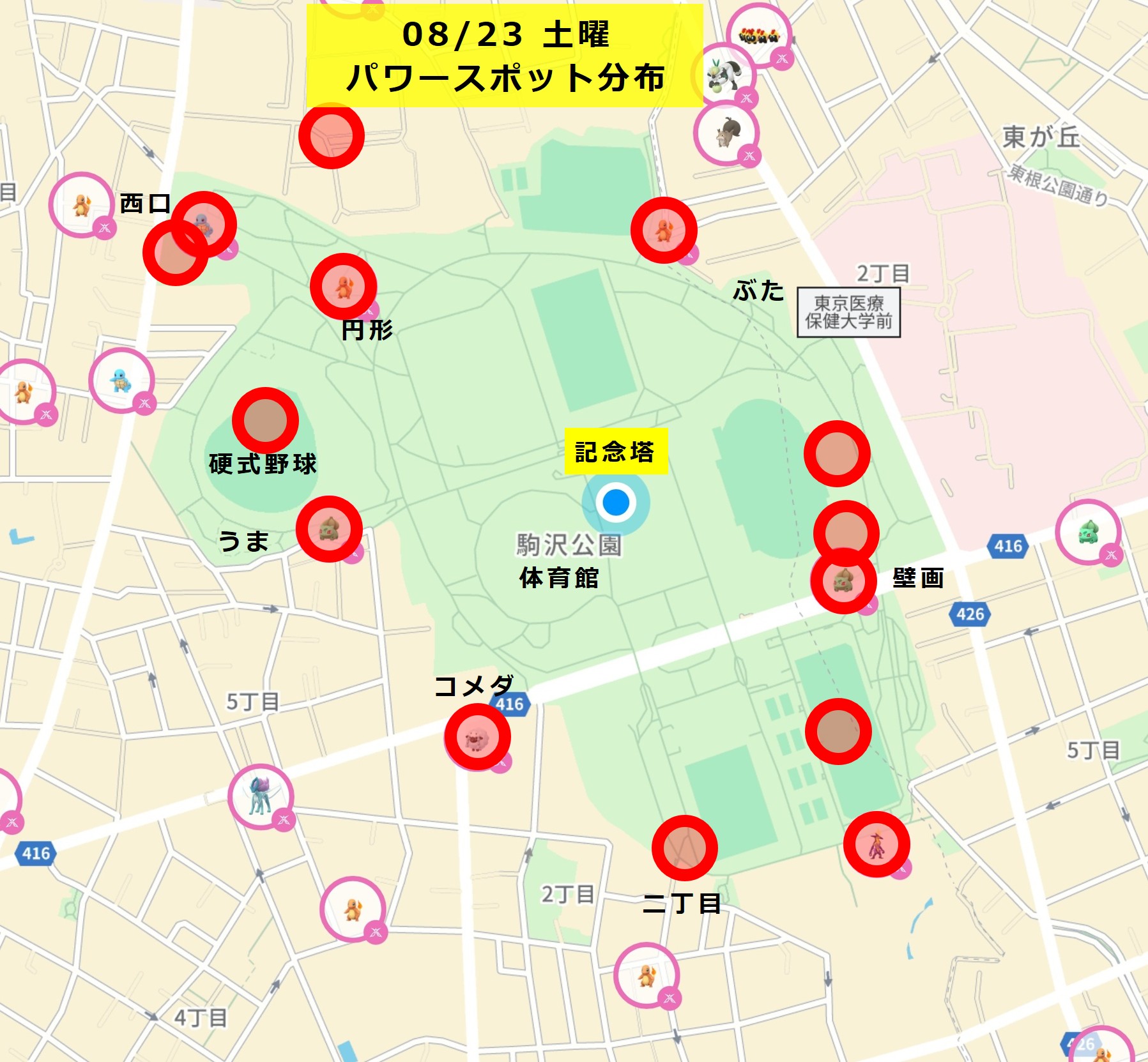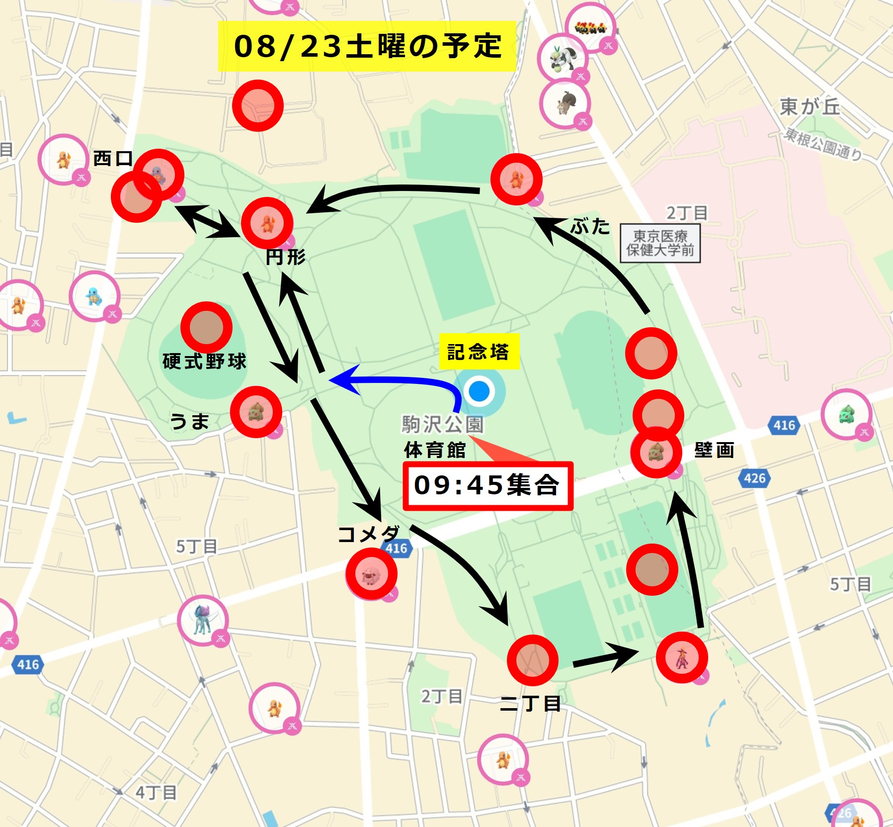 人数が多い場合、(最寄りのうま公園は混雑しているので)まず円形花壇に向かいます。その後は、公園をぐるりと廻るコースとなります。細部はムゲンダイナの強さやプレイヤーの人数、途中のキョダイマックス参加希望などを考慮して決めていきます。