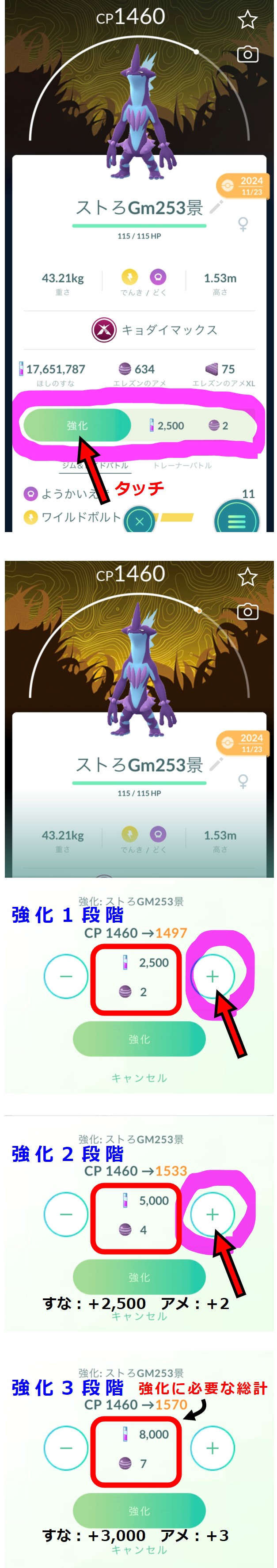 強化は数段階分チェックすれば十分です。ポケモンレベルが上がるにつれて1段階強化に必要な砂やアメの個数が増えていきます。